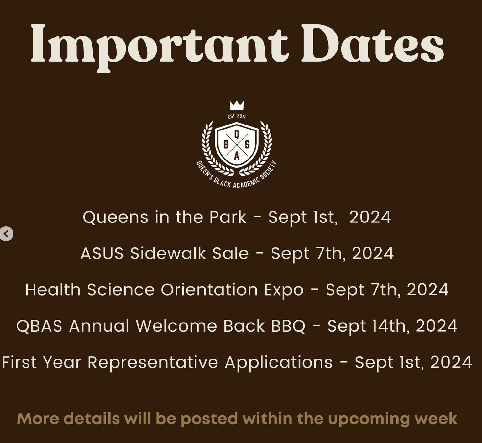 "Hello Queens students!!! We are so excited with back to school right around the corner!!! Here are a few dates to look out for the upcoming few weeks!!!" -@queensblackacademic